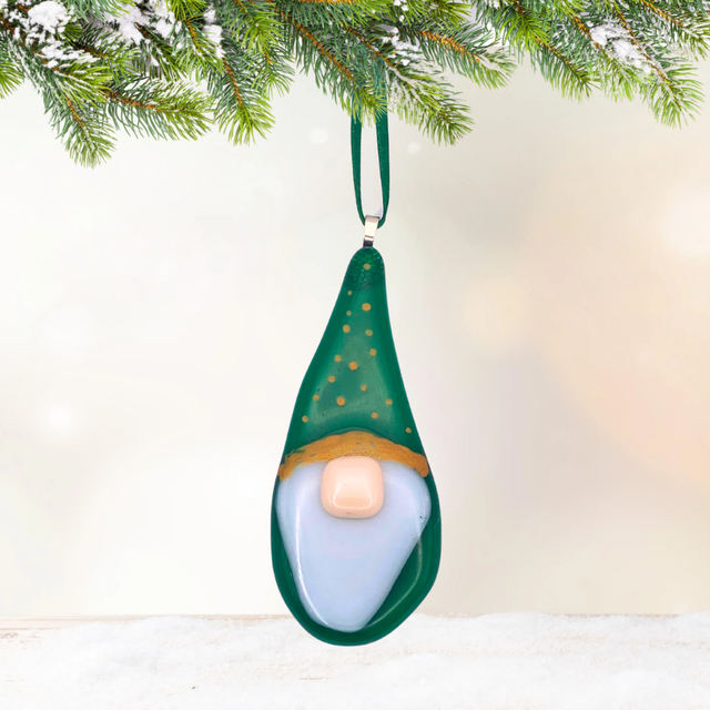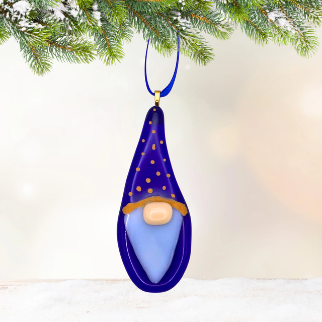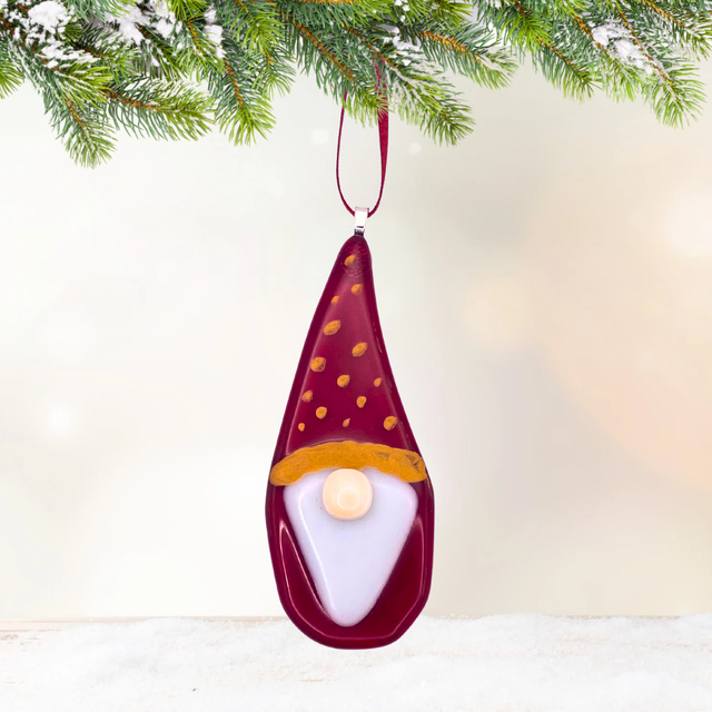Handmade fused glass gonk. Measuring approximately 9 x 3.5cm. Comes with a matching ribbon and available in red, blue and green.
